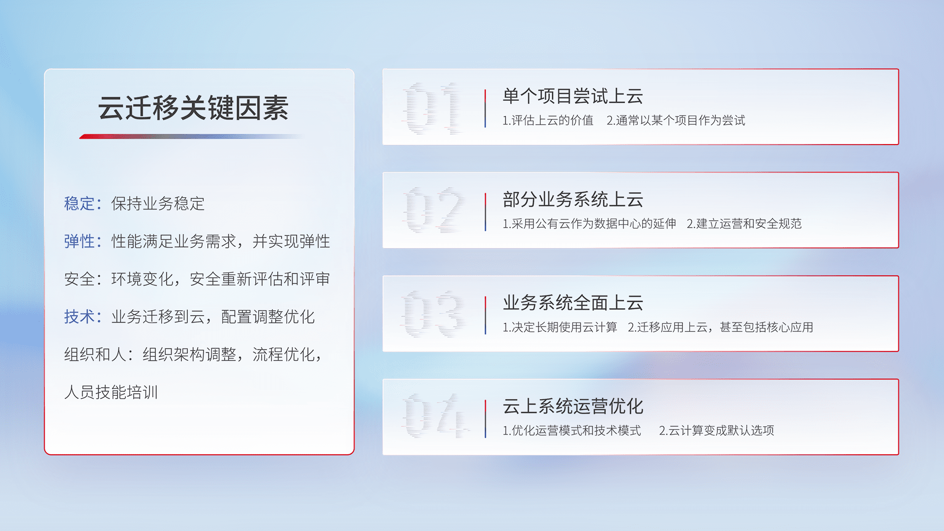 结合实际业务,,,,从规划设计、、、、云平台选型、、云原生改造、、、数据迁移、、集成交付,,,,迁移全过程为客户识别最佳上云路径,,,,做好风险识别管理,,设计网络架构、、身份权限、、、、安全审计合规、、、、操作审计、、、、日志审计、、监控告警策略、、、、多站点容灾设计等,,对云上基础设施进行整体规划,,,,提升IT治理水平,,,以满足弹性、、、高可用、、、高性能的需求。。