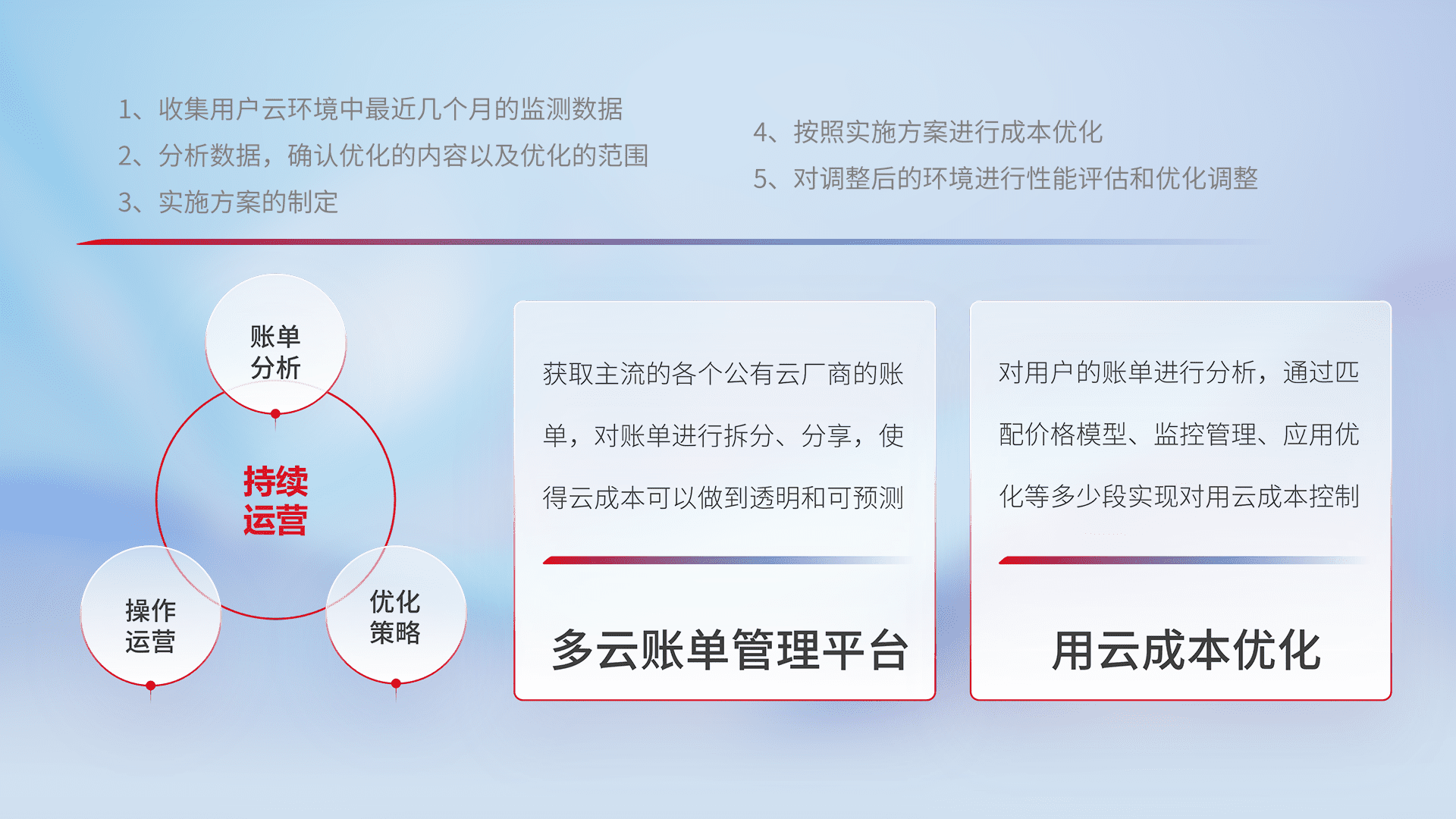 通过多云纳管,,,以统一的资源数据模型把客户的云资源进行抽象和封装,,进而实现对多云资源的统一操作,,,保障云资源管理的可靠性、、、、稳定性与可用性。。。。量身定制化运维内容,,,配置、、、、开发运维、、、补丁管理、、、备份、、、、监控、、、、认证和访问管理、、审计和日常巡检等,,,保障在用云过程中的可靠度,,稳定度以及高可用率。。。